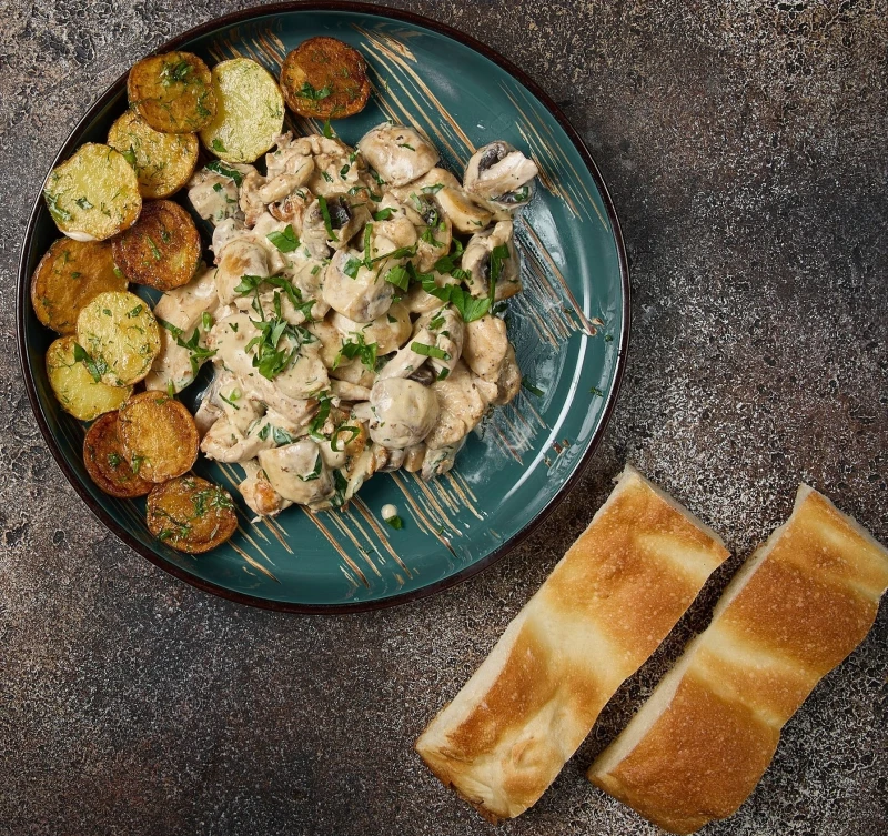 куриная грудка, шампиньоны, сливки, зелень, картофель черри