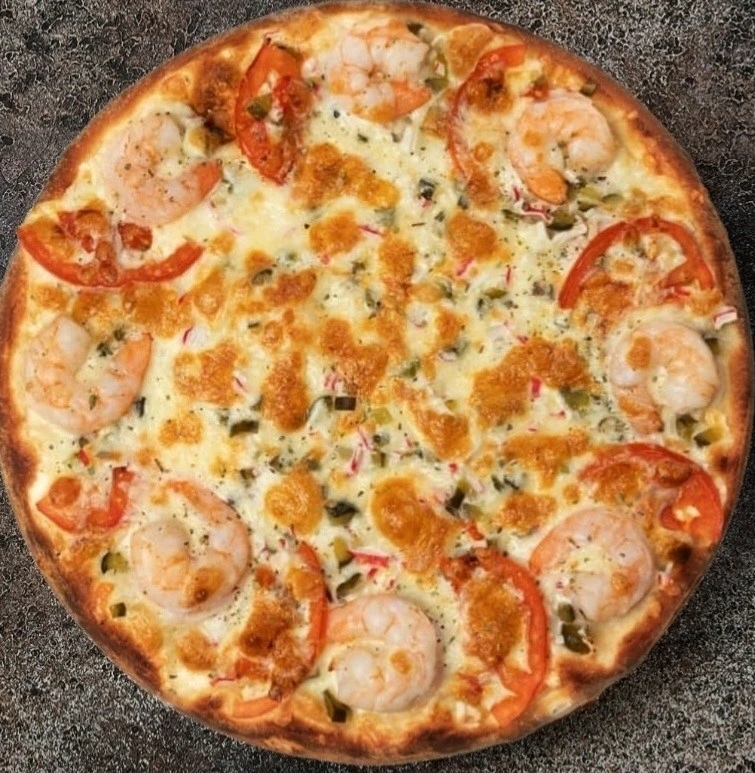 королевские креветки, имитация краба, корнишон, помидор, сливочный соус, моцарелла, орегано